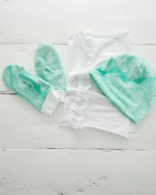 Oma kaulurini on ihan vain yksinkertaista trikoota, johon piti kuitenkin saada vähän tyttöfrillaa mukaan. Lapasissa on vuorina harmaata fleeceä ja pipo on kaksinkertaista trikoota.