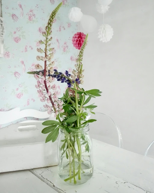 Tai sitten on todettava tilanne, vedettävä huppu pään yli ja lähdettävä sateeseen. Eilen koiran lenkityksen lomassa poimittiin lasten kanssa vettä valuvia lupiineja pellon reunasta. Halpaa hupia ja niin kivan näköisiä ruokapöydän päällä lasipurkissa.